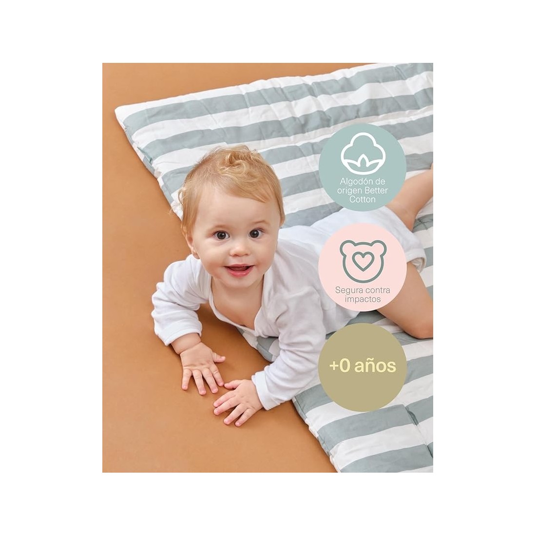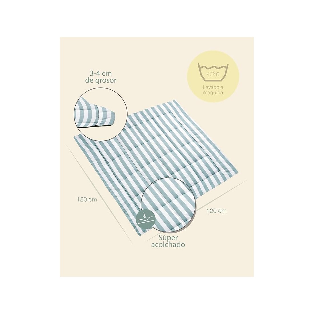 Con su tamaño amplio de 120x120 cm y su relleno mullido, proporciona una superficie acolchada perfecta para gatear, jugar o descansar.