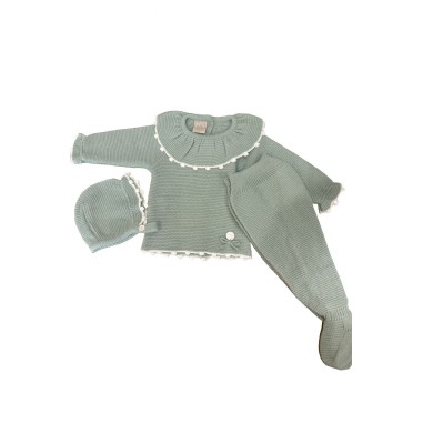 Conjunto de punto 3 piezas para bebé: polaina, jersey y gorro a juego. Color menguado con bodoques. Marca PrimBaby.