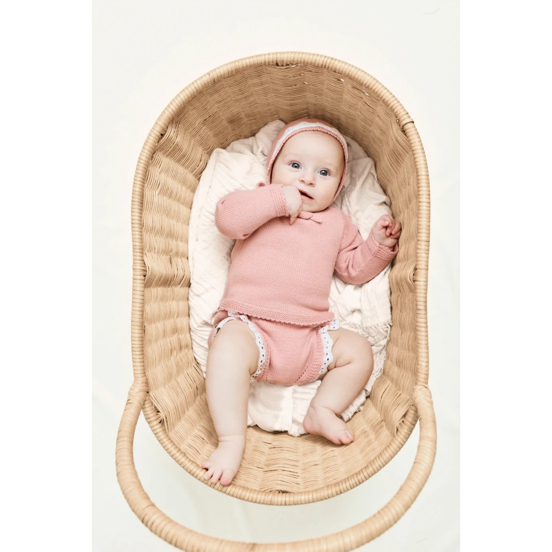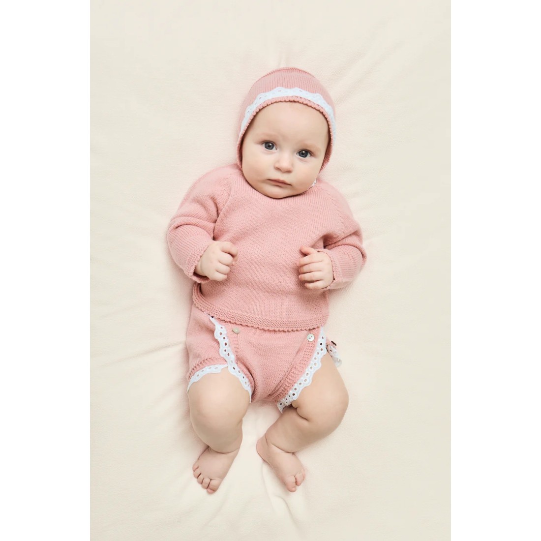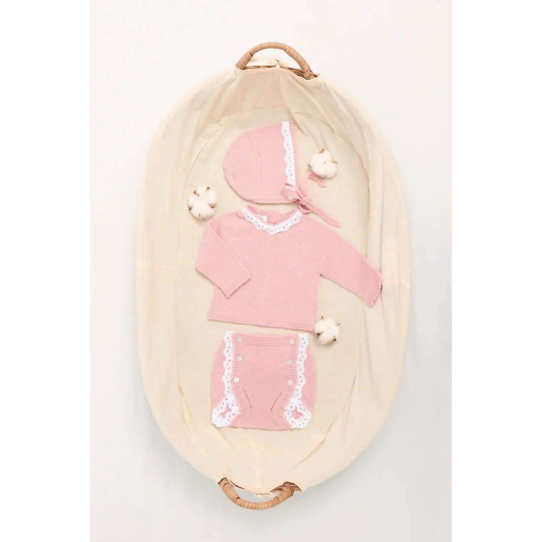 Conjunto de punto para bebé en color fresa, compuesto por jubón, cubrepañal y capota. Suave, elegante y perfecto para recién nacido.