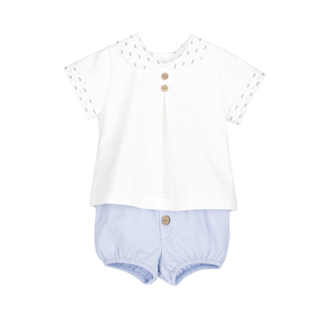 El conjunto pololo Goa es una opción ideal para vestir al bebé con un estilo clásico y delicado durante la primavera y el verano. Está formado por una camiseta de manga corta con cuello bebé y detalles cuidados, combinada con un pololo a juego que aporta comodidad y libertad de movimiento.