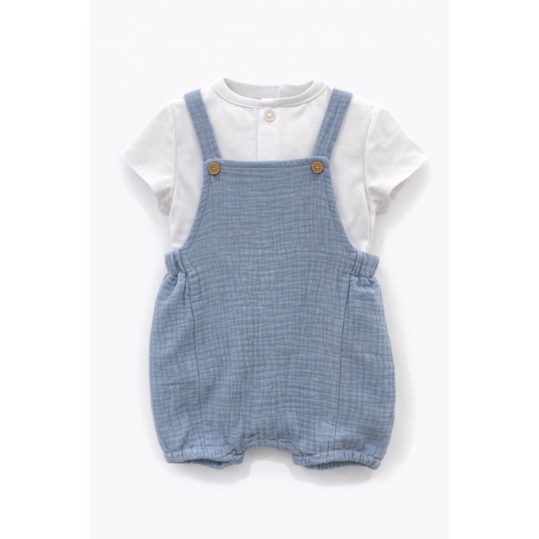 El peto presenta un diseño sencillo con tirantes y botones decorativos en la parte frontal, además de cintura y perneras ligeramente fruncidas para ofrecer mayor comodidad y libertad de movimiento. La camiseta, de líneas limpias y tejido ligero, combina perfectamente con el peto creando un conjunto armonioso y fácil de vestir.