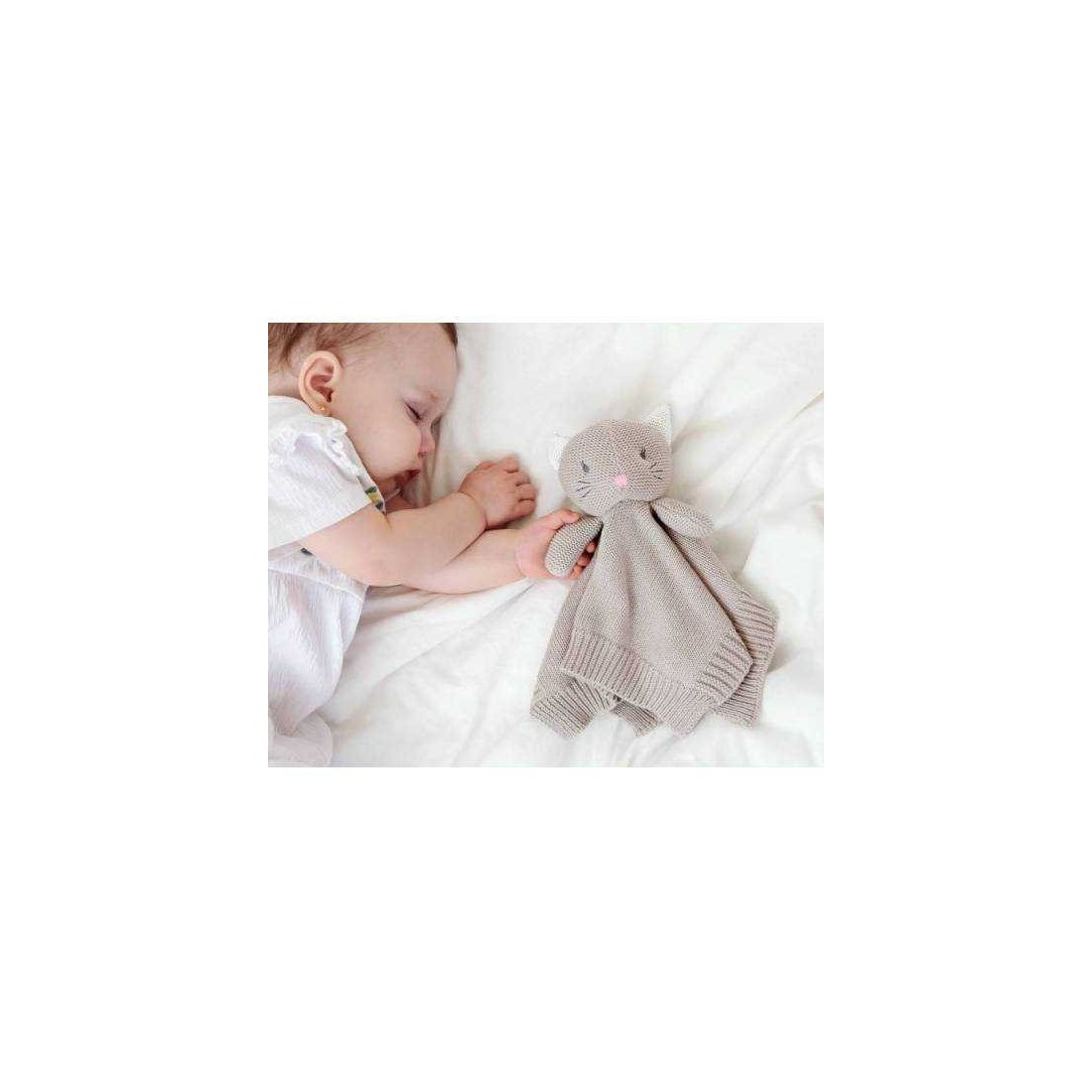 El diseño del gato, con su expresión dulce y su tejido agradable, aporta un toque natural y acogedor al entorno del bebé.