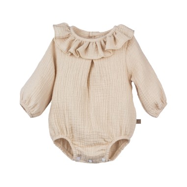 Pelele Calamaro Baby en color arena, tejido suave y transpirable con cierre a presión. Elegante, cómodo y práctico.