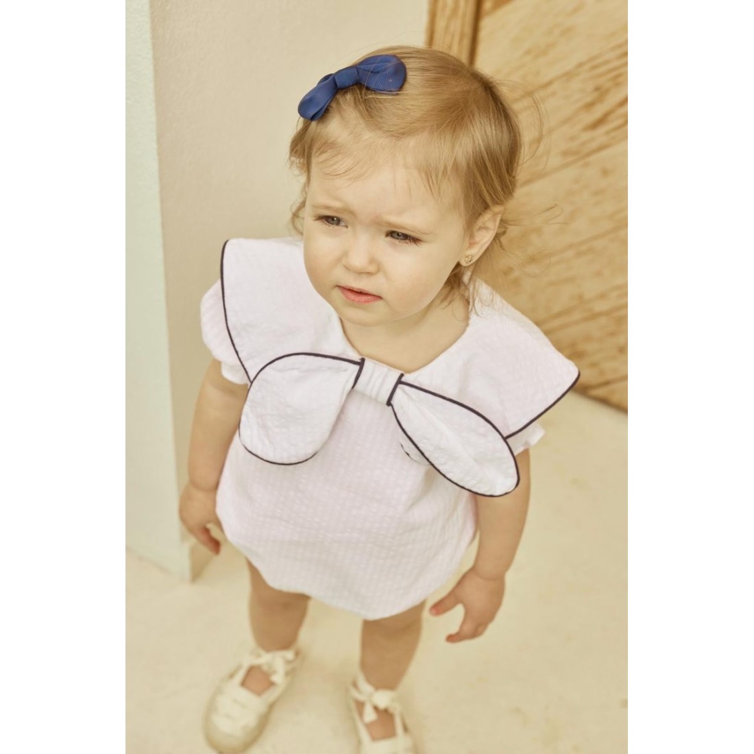 Confeccionada en tejido blanco con textura sutil, destaca por su precioso cuello estilo marinero con ribete en contraste, que aporta un toque distinguido y muy dulce. Su diseño combina elegancia y comodidad, permitiendo libertad de movimiento durante toda la celebración.
