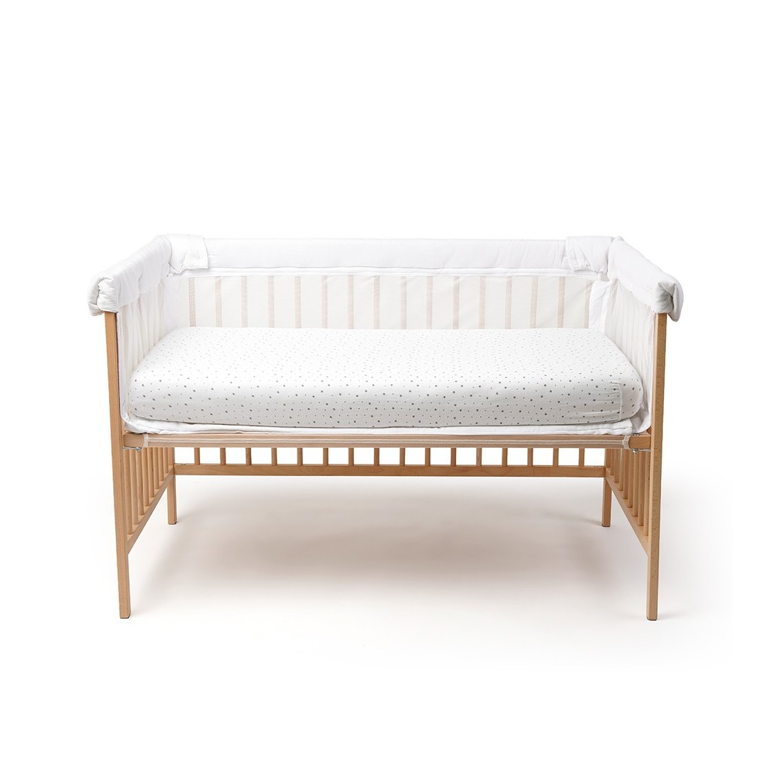 El diseño con laterales de igual altura asegura una cobertura uniforme, mientras que su función colecho lo convierte en una opción práctica para padres que desean mantener a su bebé cerca durante la noche sin renunciar a la seguridad.