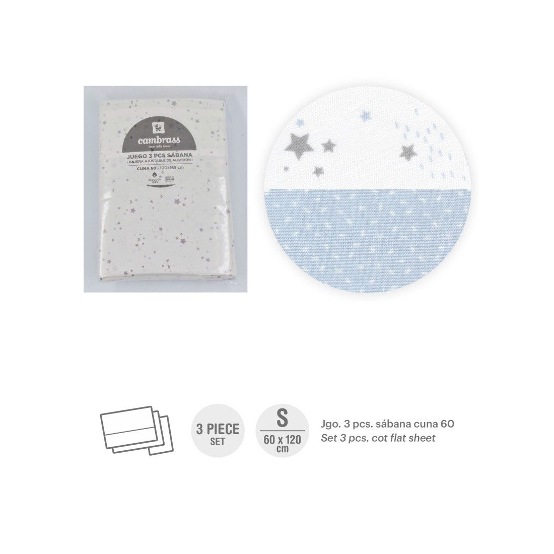 Juego de sábanas Cambrass Sky Celeste para cuna de 60x120 cm. Incluye 3 piezas: sábana encimera, sábana bajera ajustable y funda de almohada. Fabricadas en algodón 100% de alta calidad, suaves y transpirables para el descanso del bebé.