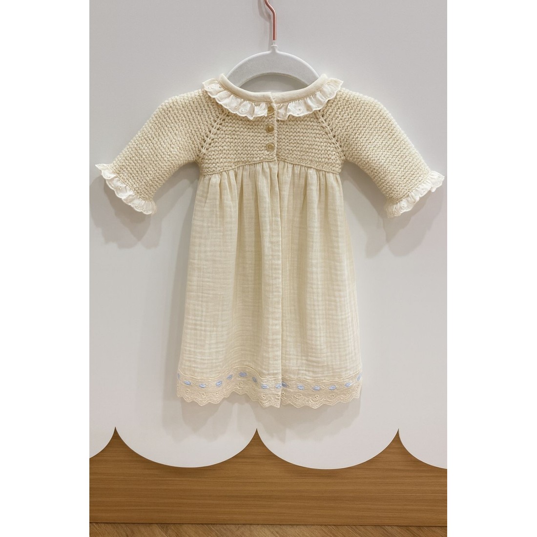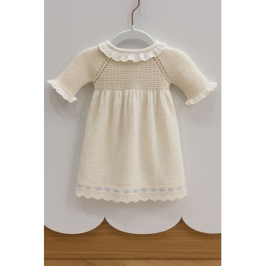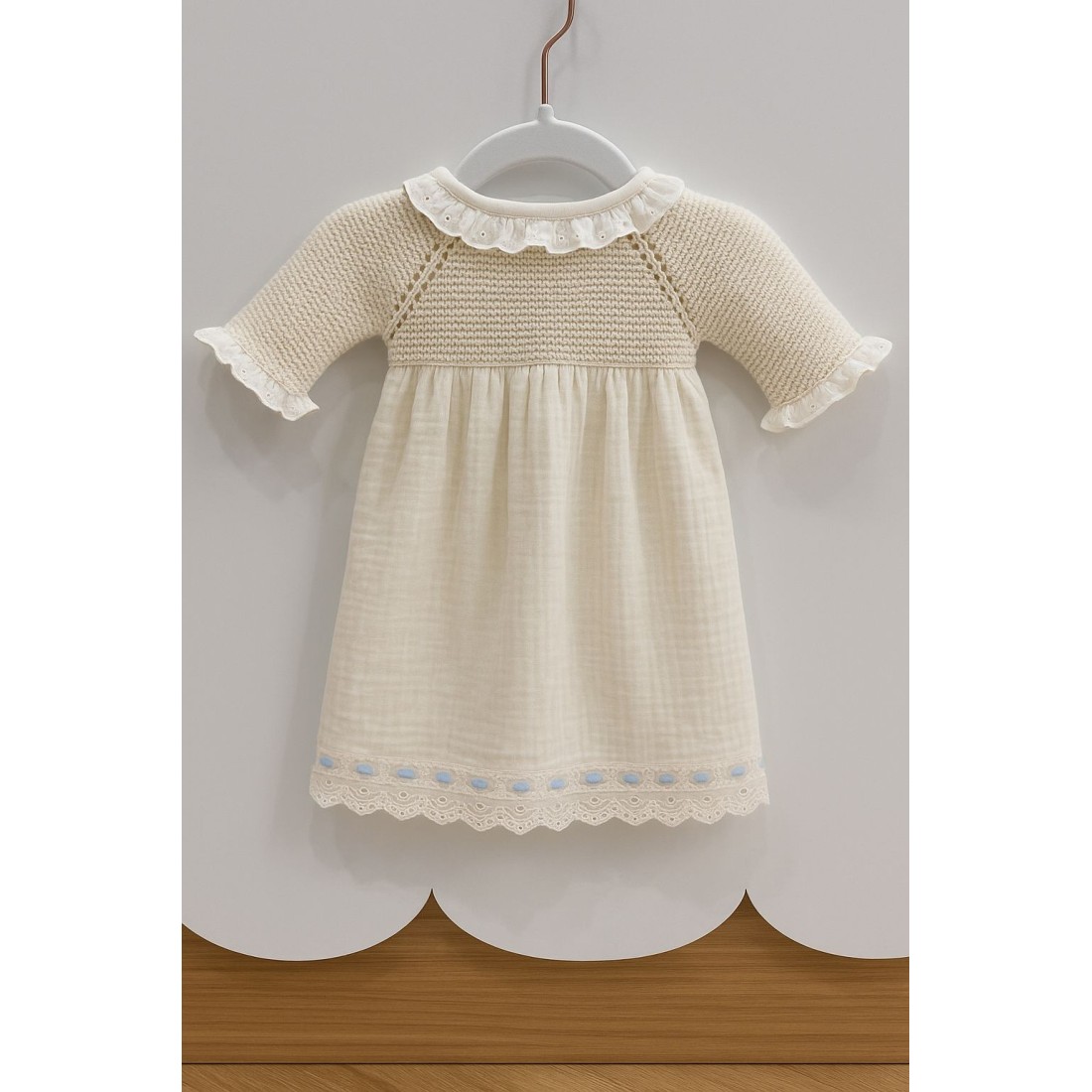 Faldón en tono crudo con cuerpo de punto, cuello rizado y detalle de entredós azul en el bajo. Elegante.