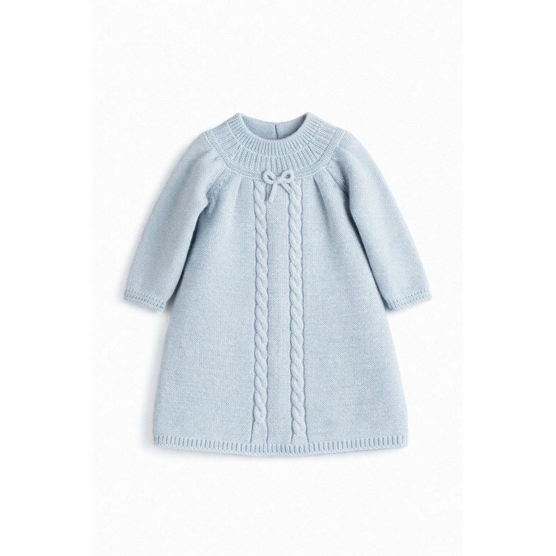 Su diseño en azul celeste, con trenzas verticales en el frontal y un pequeño lazo decorativo, aporta un toque clásico y atemporal. El corte cómodo y el tejido flexible permiten libertad de movimiento, convirtiéndolo en una opción ideal tanto para el día a día como para celebraciones especiales.
