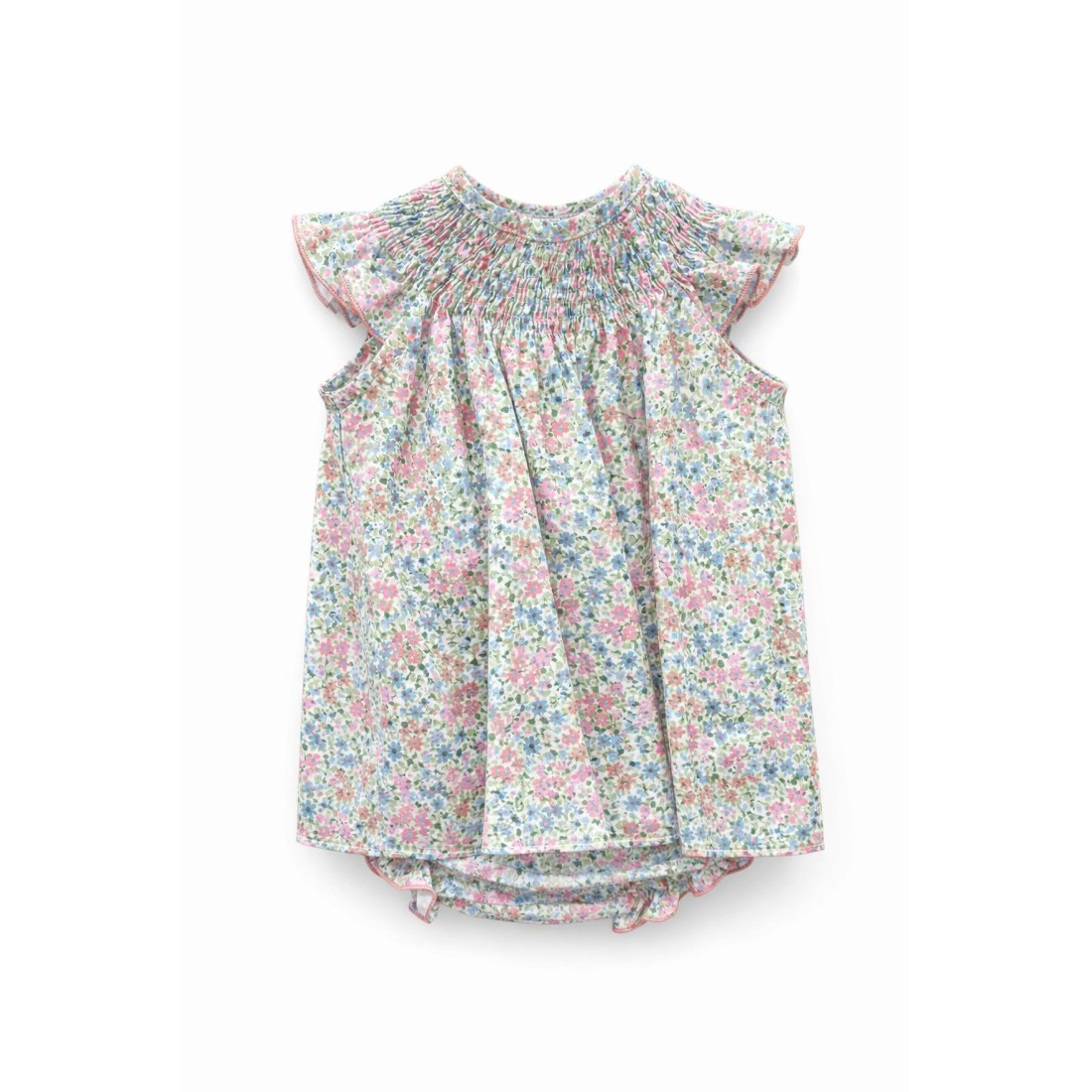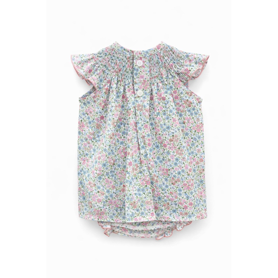 Cuenta con un canesú fruncido en el cuello, que crea una caída fluida y cómoda, y manga corta con volante, rematada con un sutil ribete que realza el acabado de la prenda. El cierre trasero con botones facilita la puesta y mantiene el diseño limpio y elegante.